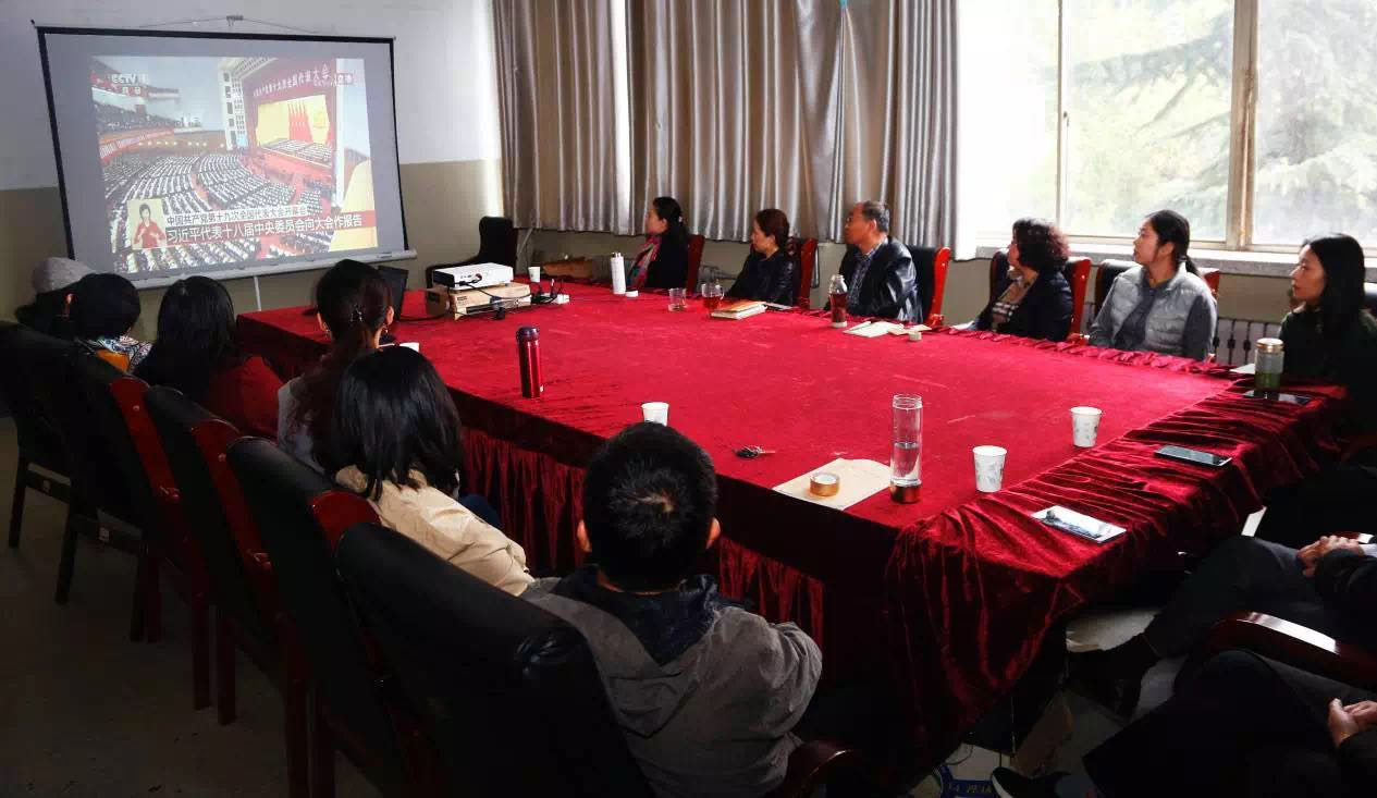 在会议室和1107教室分别组织教工党员、学生党员、入党积极分子和学生干部等班级骨干观看直播盛况,集体学习习近平总书记所作报告。