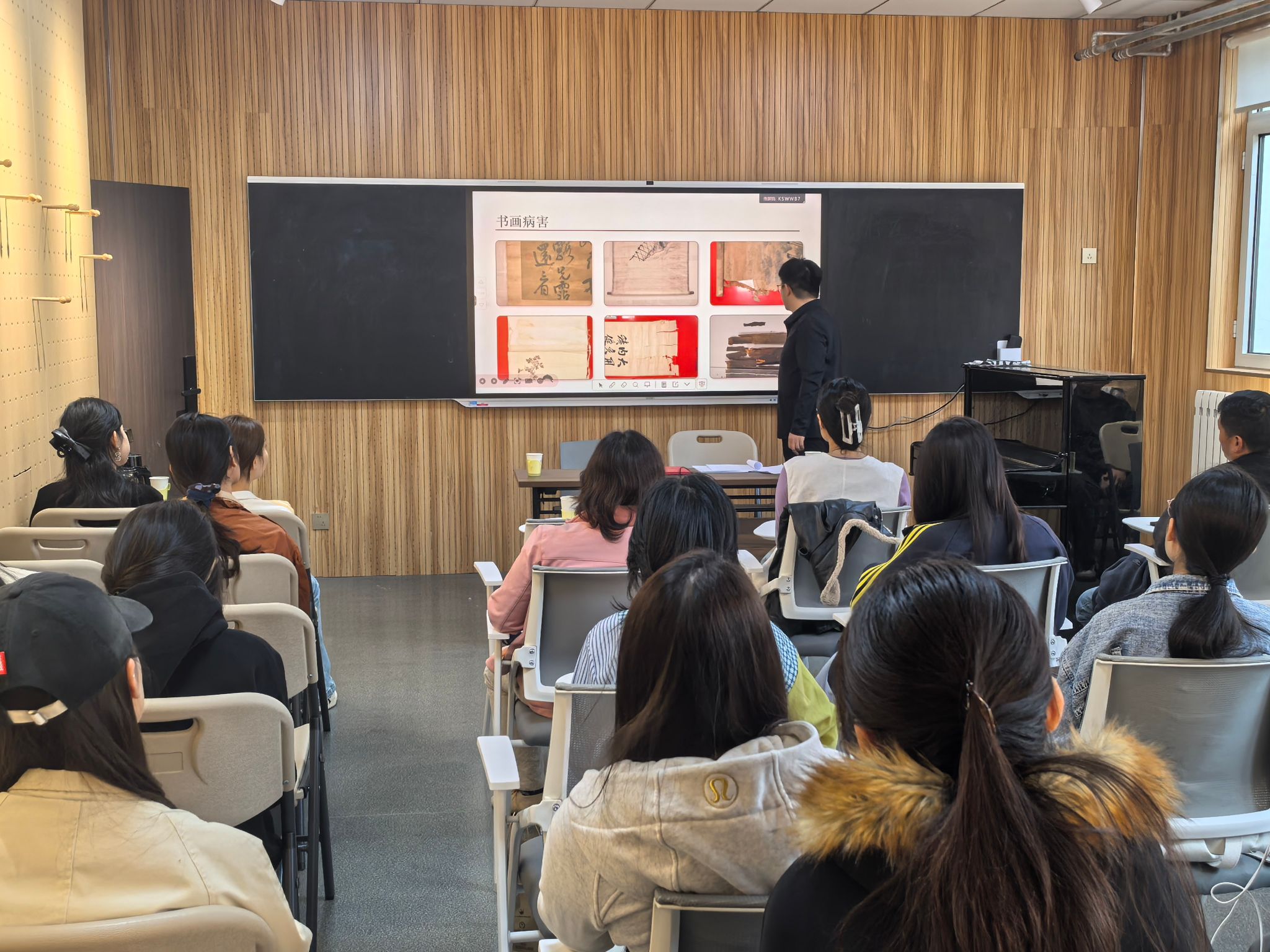 魏方斌结合从业经验,以“理论+演示+互动”形式开展讲座。理论导赏环节科普纸本、绢本特性,解析书画保存中的常见问题。技艺演示环节现场展示修复基础技巧,让同学们感受苏裱技艺的精湛。在互动环节中,从艺术经济学视角分享非遗在数字时代的价值,并解答同学们的疑问。他希望推进非遗传承与通识美育相融合,让非遗文化在校园扎根开花。