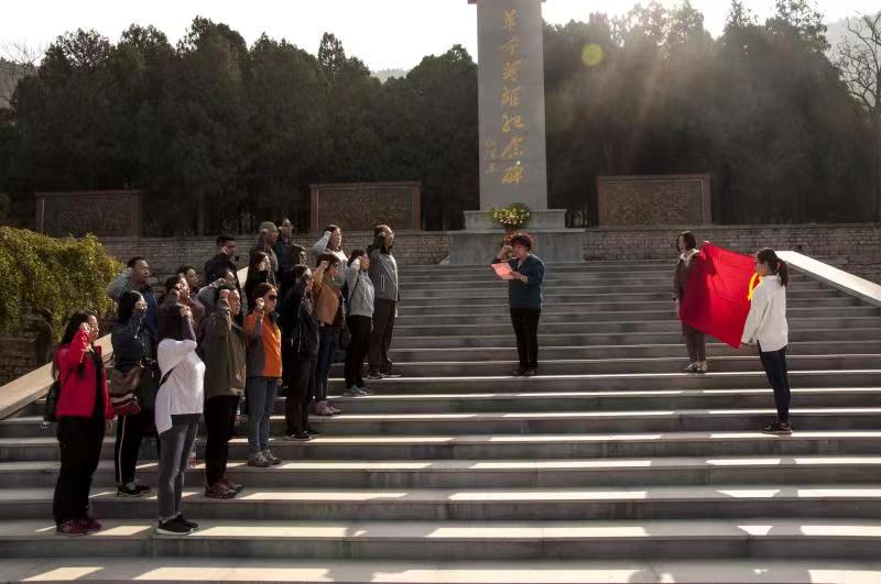 在苍松翠柏掩映下的革命烈士纪念碑前,全体党员认真聆听讲解员对大峰山地区革命事迹的生动介绍,详细了解大峰山作为抗日战争期间“长清的小延安”做出的重要贡献和巨大牺牲,深切缅怀在大峰山英勇献身的革命先烈。在庄严肃穆的气氛中,全体党员向革命烈士敬献花篮并集体默哀,在鲜红的党旗前,注册送彩金论坛党委书记杨春丽同志带领大家重温入党誓词,共同表达了继承革命先烈遗志,不忘初心,永远忠诚于党和人民,为中国特色社会主义伟大事业贡献一切的拳拳决心。