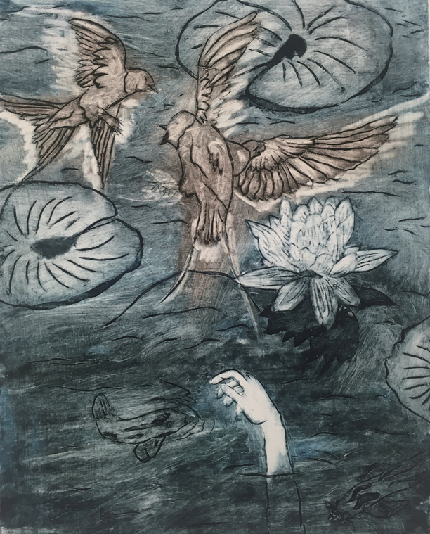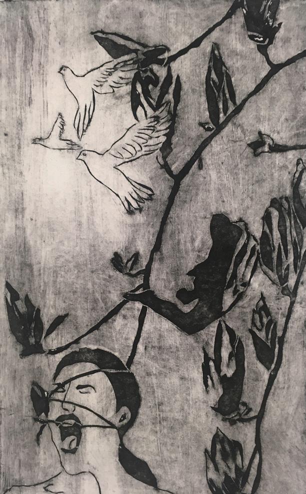 Within my art, I had noticed that birds, plants, and the human figure were elements that were naturally recurring in my compositions. I wanted to explore why these three elements were in my subconscious. My artwork deals with the manipulation and juxtaposition of these three elements to express the emotions that I was feeling subconsciously at the time of making each piece. When creating a composition I don’t meticulously plan every detail. Generally, I try to find imagery of one of the elements in the moment that I like and piece all of the remaining elements together as I go. constantly changing the positions and scale of each until it seems right.When creating the plate I started with positioning the figure in the bottom left of the composition. I liked the expression of anger and frustration that the figure had. Next, I placed the plants, finding a position that I felt drew attention to the figure. Lastly, I put the group of three doves into the composition. Making it seem that they were flying away from or out of the figure. I created the plate for this piece during the summer of 2021. At the time there were still many restrictions in place because of the coronavirus pandemic. After seeing the final printed version of this plate I remember feeling particularly frustrated with the situation when creating the plate. For me This piece symbolizes the frustration and anger felt during the pandemic and the hope that eventually life would go back to normal.