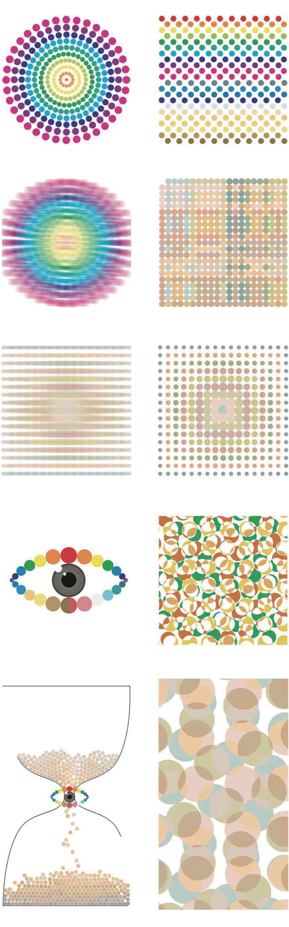 视觉健康科学图系设计是面向的人们所不甚了解的知识体系,因此通俗化和大众化是设计的必要特征,此设计设计元素提取自视力表和色盲图,通过大量的图形进行秩序感排列,画面运用高斯模糊将设计的作品进行一个模糊化,形成近视人群所看到的样子,制造出一种动态画面,在色彩选择中,大量运用明度较高的颜色,进而产生近视的模糊状态和色盲的颜色混乱进行联合。
