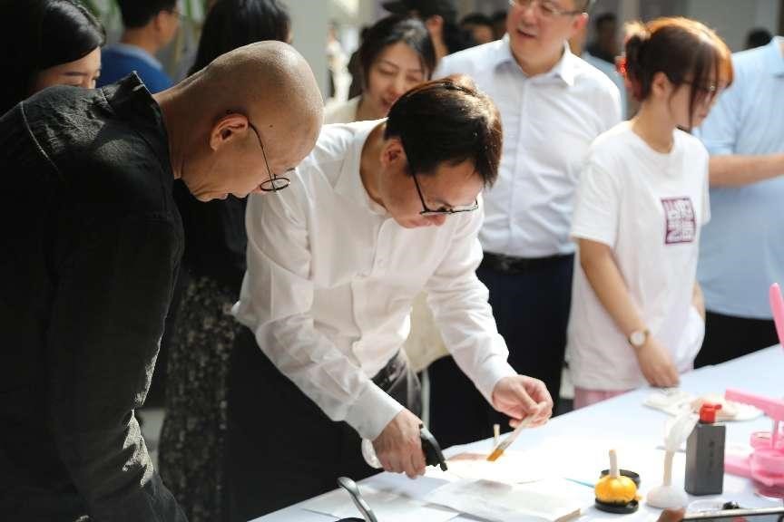 开幕式结束后,与会领导师生一起参观了展览。洪俊杰和学生进行了漆扇制作,以漆为笔,以水作画,创作独一无二的非遗漆扇,共同体验东方美学。