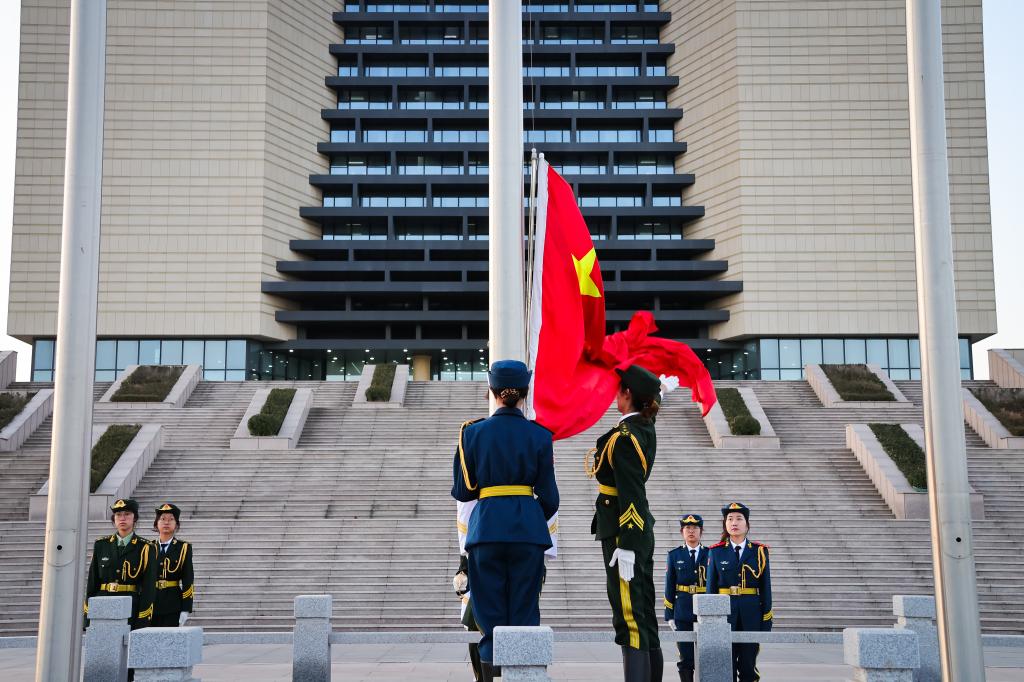 清晨,师生整齐列队,肃立广场。国旗护卫队护送国旗入场,伴随《义勇军进行曲》,五星红旗冉冉升起,全体师生行注目礼,爱国热情在庄严氛围中涌动。