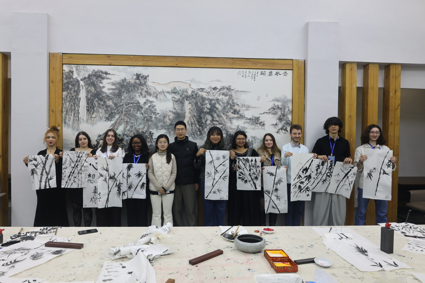 美术学专业学生顾子煜、张燕琪现场示范国画墨竹的画法,从运笔技巧、墨色调配、疏密布局,逐一细致讲解、指导。访团成员兴致盎然地在宣纸上挥毫泼墨,形态各异、充满意趣的墨竹作品跃然纸上。
