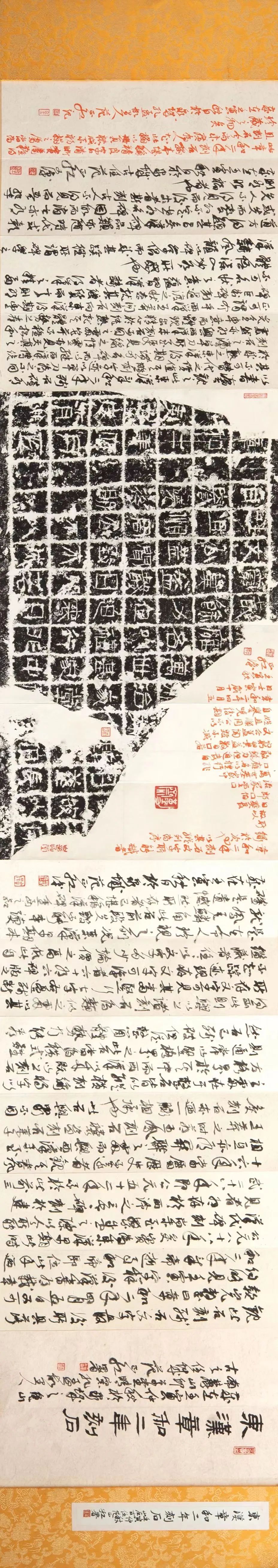 观此石刻残石文字最后所具落款完整曰 :章和二年四月五日,又可约见壬寅字样。后汉书有载,章和二年章帝逝而和帝即位,此年乃公元八十八年矣。实为东汉早期,此时汉代碑刻尚未至繁盛之际,以今所能见者有存于西泠印社“三老碑”刻于建武二十八年,即公元五十二年,系于此前三十六年当属历史不远者。观其书风,相互亦有关联之处,而与西汉末至王莽之时若,王凤刻石、禳盗刻石、莱子侯刻石亦乃一脉相承也。此石与众不同之处在于整石皆以纵横刻线将字以方格界于其中,而西汉以来,既以上刻石则通常以竖格界之,此石当为横式,虽然石已残破,但从整个体势乃能看得出,此则与以上诸刻石为类似之处,以其所存文字可见其当竖行七字,右边残断不知踪迹,现存文字可识者六十有六,碑版之鉴藏者往往以文字多少论价之高低,此自是在令人珍视之列,况东汉早期本就凤毛麟角,此石前段失毁,不能卒读,确是遗憾,然所存者已堪称汉碑重要之品。岁在壬寅秋日于泉城,范正红识。